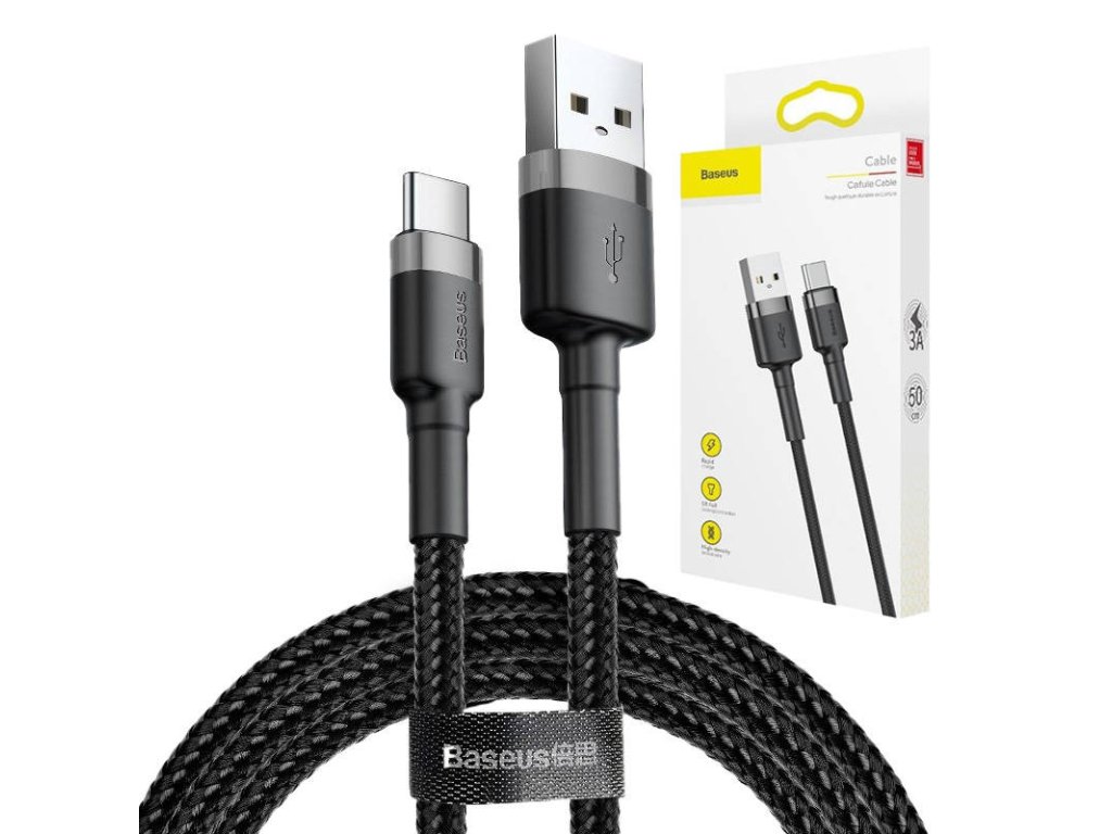 Baseus Cafule je vysoce kvalitní kabel USB typu C určený pro přenos dat a nabíjení zařízení. Zesílená konstrukce zajišťuje zvýšenou odolnost proti přetržení. Navíc byly při konstrukci použity materiály zpevňující strukturu zástrček (např. hliník).